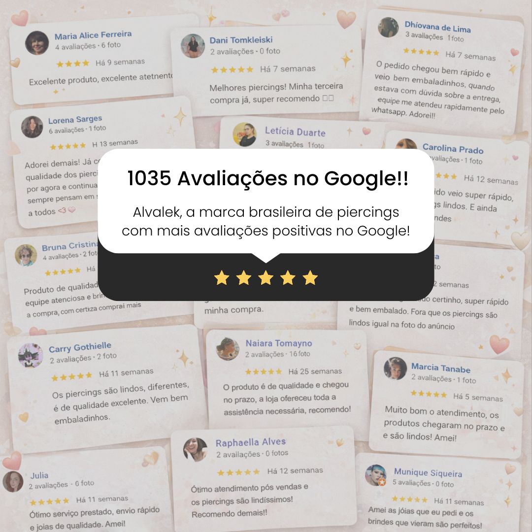Na Alvalek, oferecemos uma ampla variedade de modelos para diferentes anatomias e preferências. Desde piercing retos, disponíveis com topos simples ou sofisticados com zircônias, até as versáteis argolas que combinam com qualquer estilo, aqui você encontrará o piercing que sempre sonhou.